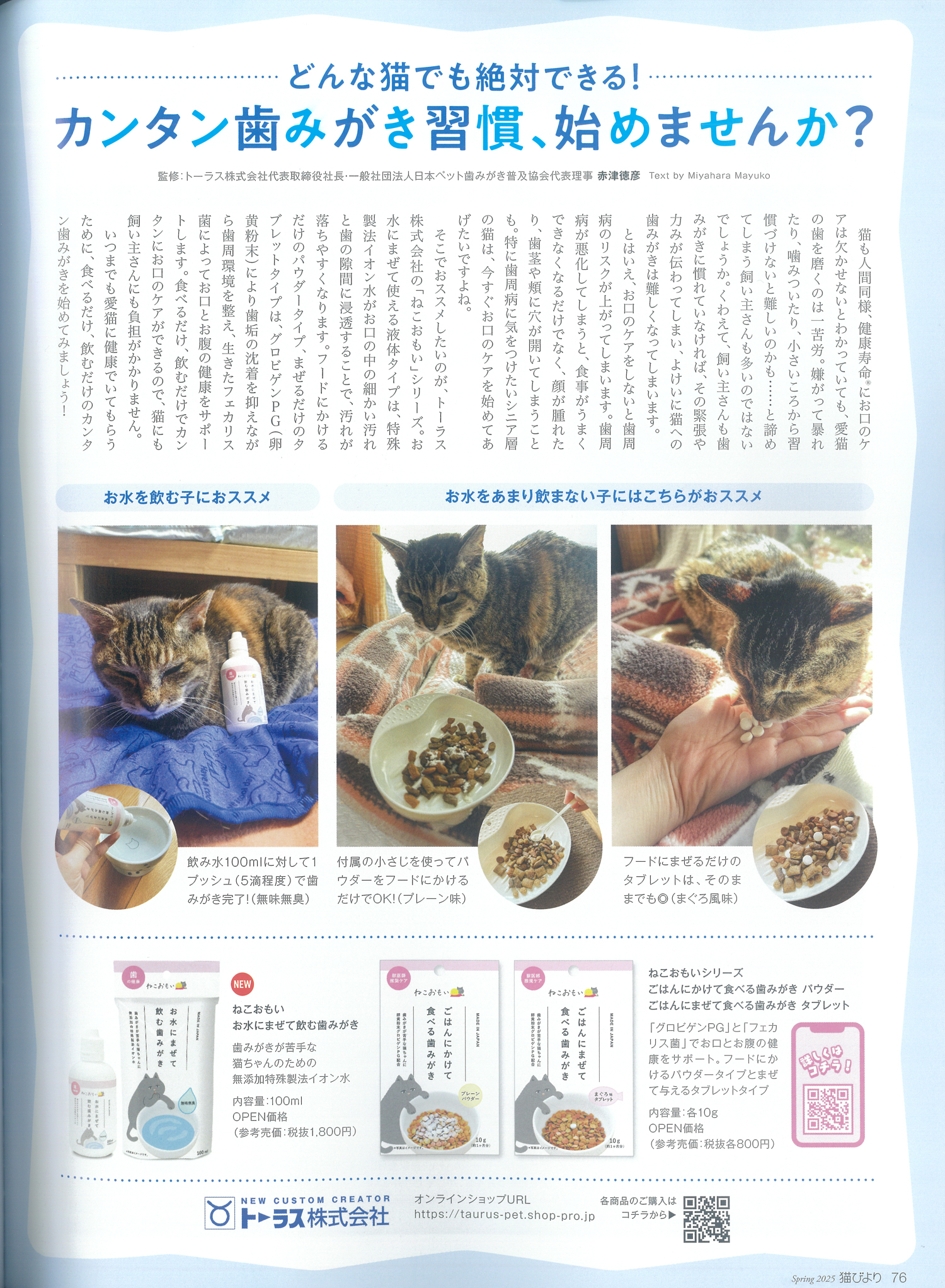 “癒し”をキーワードに様々な形で「ネコ」の魅力を紹介するムック『猫びより 2025年春号』で代表取締役社長 赤津監修の『どんな猫でも絶対できる!カンタン歯みがき習慣、始めませんか?』が掲載されました。