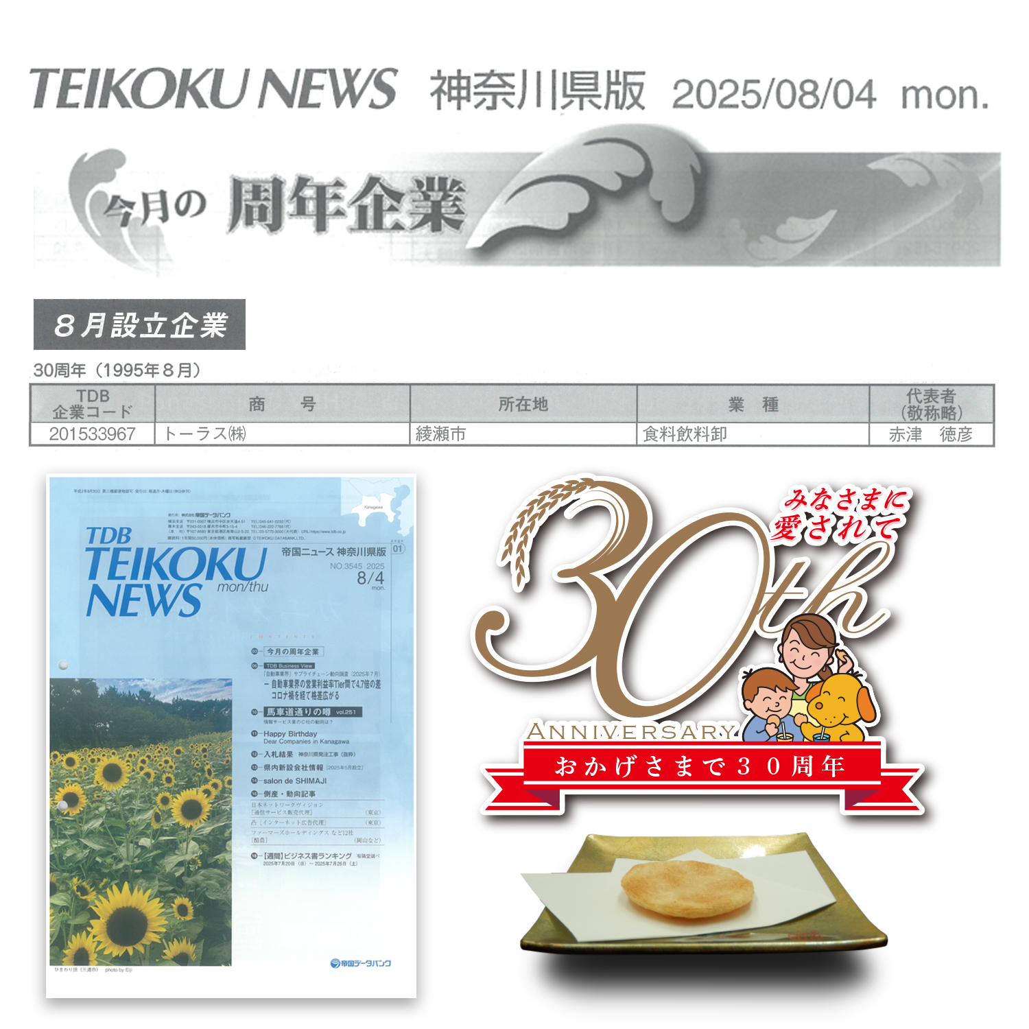 帝国データバンクが発行する情報誌『TDB TEIKOKU NEWS』神奈川版No.3545の『今月の周年企業』でトーラス株式会社が紹介されました。