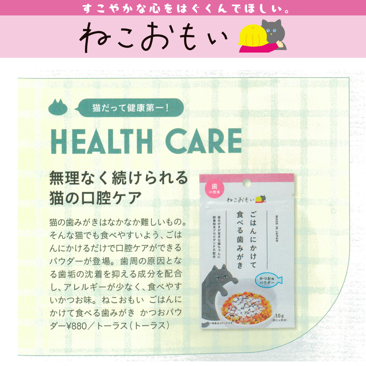 ナチュラルファッション、美容、レシピ、ヘルスケア、北欧情報など、日々の暮らしに寄り添う情報誌『リンネル』4月号の”リンにゃル猫の日NEWS”で『ねこおもい ごはんにまぜて食べる歯みがき かつお味パウダー』が紹介されました。