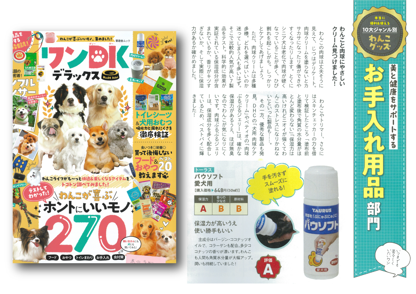 愛犬との生活を豊かにするグッズを検証・紹介するムック『ワンDK デラックス』の『本当に便利&使えるわんこグッズ お手入れ用品部門』でパウソフトが評価Aを頂きました。