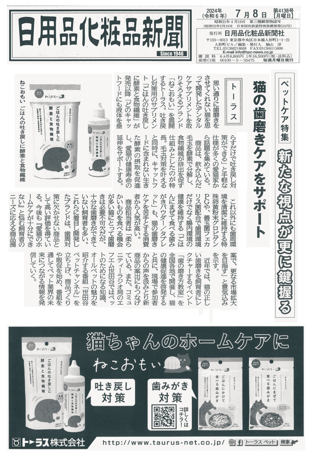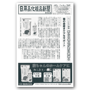 日本および海外のトイレタリー・日用品・生活雑貨・化粧品などの情報を中心に報道する専門紙『日用品化粧品新聞 4138号』のペットケア特集で『ねこおもい』が掲載されました。