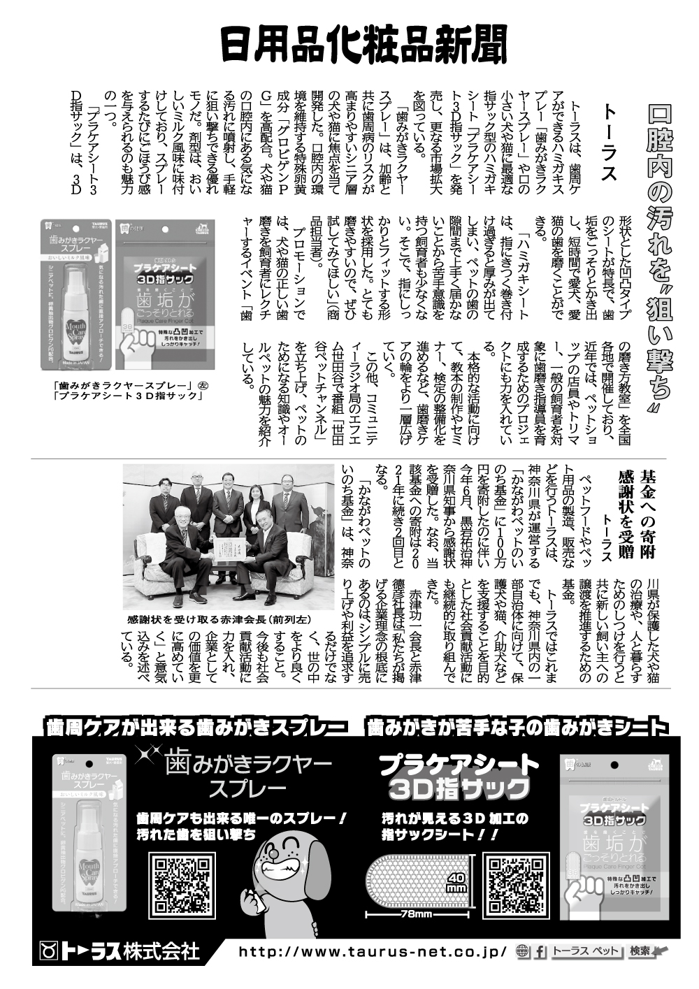 日本および海外のトイレタリー・日用品・生活雑貨・化粧品などの情報を中心に報道する専門紙『日用品化粧品新聞 4189号』のペットケア特集で『歯みがきラクヤースプレー』『プラケアシート3D指サック』の紹介と『かながわペットのいのち基金への寄付感謝状受贈』の記事が掲載されました。