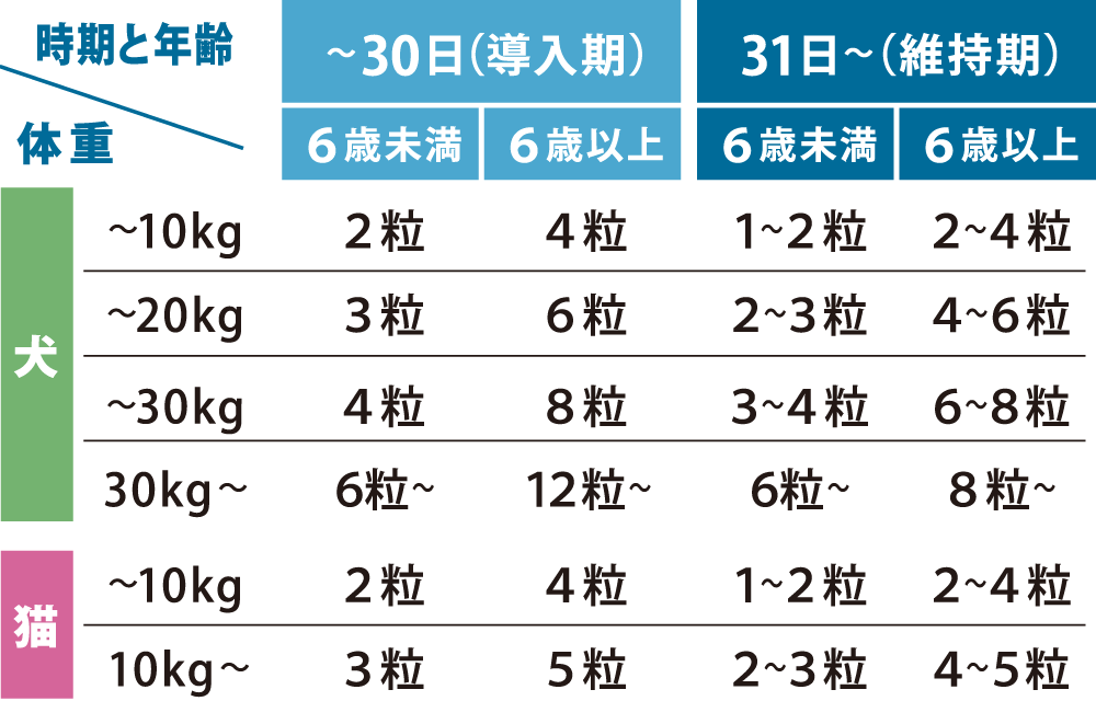 | 与え方 | 1日あたり(体重目安) 導入時(開始30日間)は、維持期の倍量を目安に1日あたり下記の量で1~2回にわけて、そのまま、又は食事に混ぜて与えて下さい。